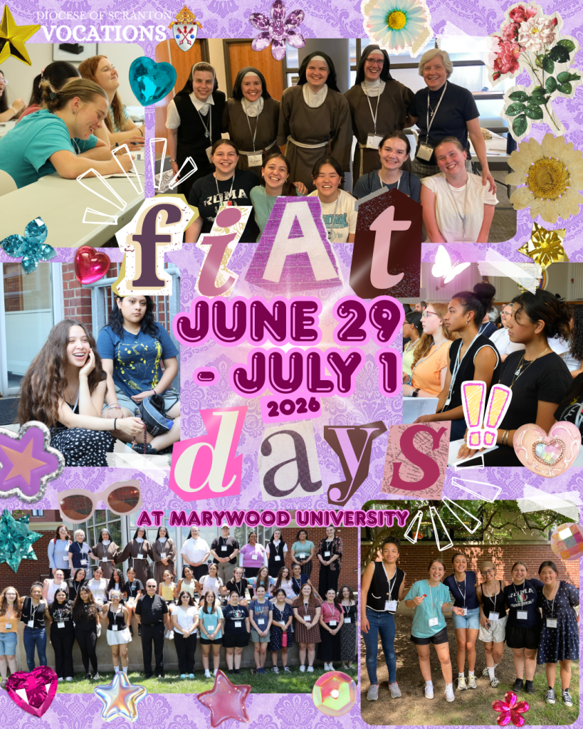 Quo Vadis and Fiat are vocation-themed summer camps open to rising sophomores through graduating seniors in high school. These camps include 3 days of fellowship, talks, prayer, worship, sports, art, music, great food, and more! Be sure to save the date and stay tuned to find out when registration officially opens! Email vocations@dioceseofscranton.org for more information.