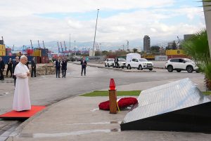 Pope Leo XIV prays at a memorial marking the site of a deadly explosion in 2020 at the port in Beirut, Lebanon, Dec. 2, 2025. (CNS photo/Lola Gomez)