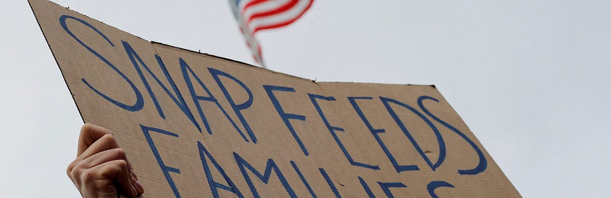 A man holds a sign during “A Rally for SNAP” on the steps of the Massachusetts Statehouse in Boston Oct. 28, 2025, ahead of the suspension of federal SNAP food assistance benefits Nov. 1 amid the ongoing U.S. government shutdown. A federal judge in Rhode Island on Oct. 31 directed the Trump administration to pay SNAP benefits, and the Trump administration said Nov. 3 it would comply. (OSV News photo/Brian Snyder, Reuters)