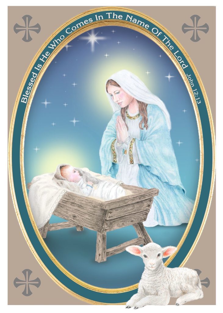 The Christmas Card, the second in “the Lamb of God Series”, is rich in symbolism, featuring the Christ Child in a wooden cradle, our Blessed Mother by His side, clearly depicting the love of a Mother and Child. The lamb, representing the lamb of God, looks out to the card holder, and the world, bringing them into the scene, so that all will share that same love.