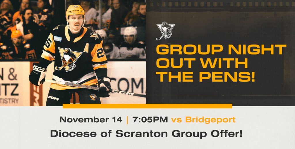 The Diocese of Scranton invites you to join them in watching the Scranton/Wilkes-Barre Penguins as they take on the Bridgeport Islanders on Friday, November 14th, 2025! Special group pricing is offered to the Diocese of Scranton and their friends and family!