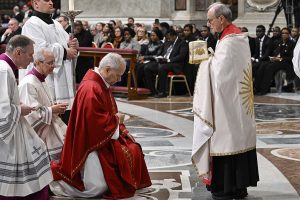 At the moment of the veneration of the cross, the pope removed his chasuble and shoes and knelt before the crucifix in a gesture of humility. Clergy followed one by one, venerating the cross on bended knee and a kiss.