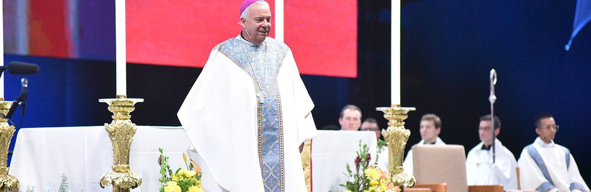 As Archbishop Pérez, more than 20 concelebrating bishops and nearly 250 concelebrating priests processed off the stadium’s floor at the end of the closing Mass, the house band struck up again the praise and worship music that filled the hearts of the 16,000 youths who joyfully celebrated their faith.