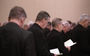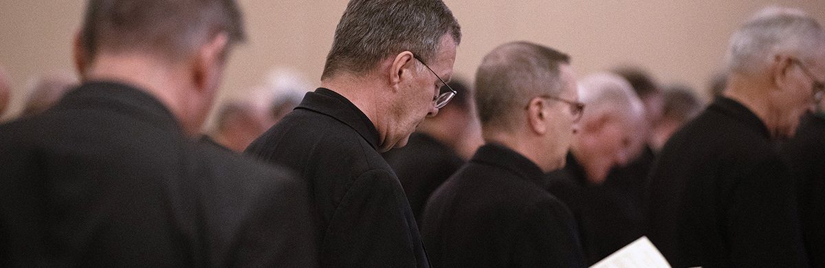 Bishops pray June 13, 2024, at the U.S. Conference of Catholic Bishops’ spring plenary assembly in Louisville, Ky. The USCCB announced Oct. 22, 2025, that the agenda for the U.S. bishops’ fall plenary Nov. 10-13 in Baltimore includes votes for key leadership roles as well as discussions on migration, health care directives, artificial intelligence, Eucharistic devotion and liturgical texts. (OSV News photo/Bob Roller)