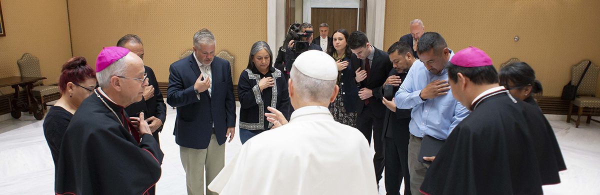 Pope Leo XIV blesses Bishop Mark J. Seitz, left, and Auxiliary Bishop Anthony C. Celino of El Paso, right, along with representatives of the Hope Border Institute and others who assist migrants in the United States during a private meeting at the Vatican Oct. 8, 2025. (CNS photo/Vatican Media)