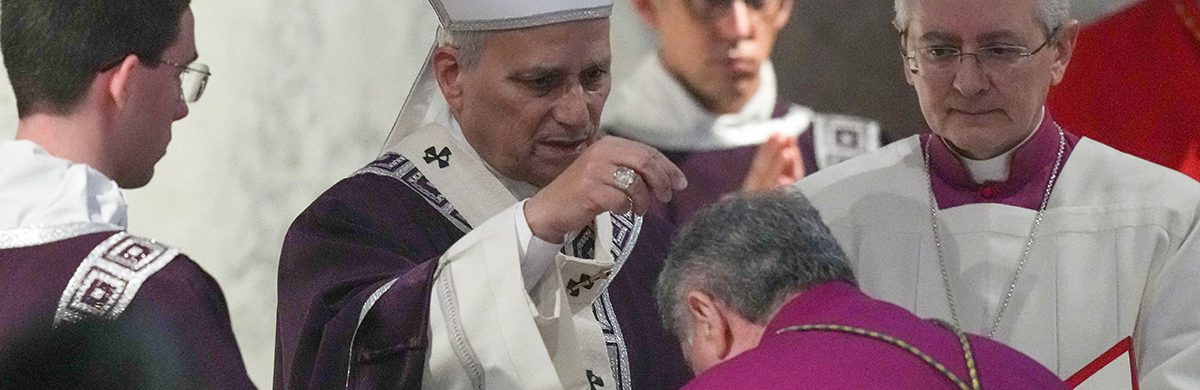 Pope Leo XIV sprinkles ashes during Ash Wednesday Mass at the Basilica of Santa Sabina in Rome Feb. 18, 2026. (CNS photo/Lola Gomez)
