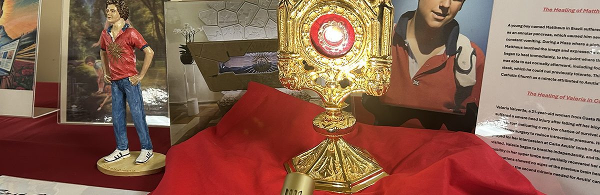 The traveling display, on loan from Malvern Retreat House in southeast Pennsylvania, features more than 100 Eucharistic miracles that Acutis researched and cataloged before his death from leukemia in 2006 at the age of fifteen.