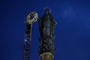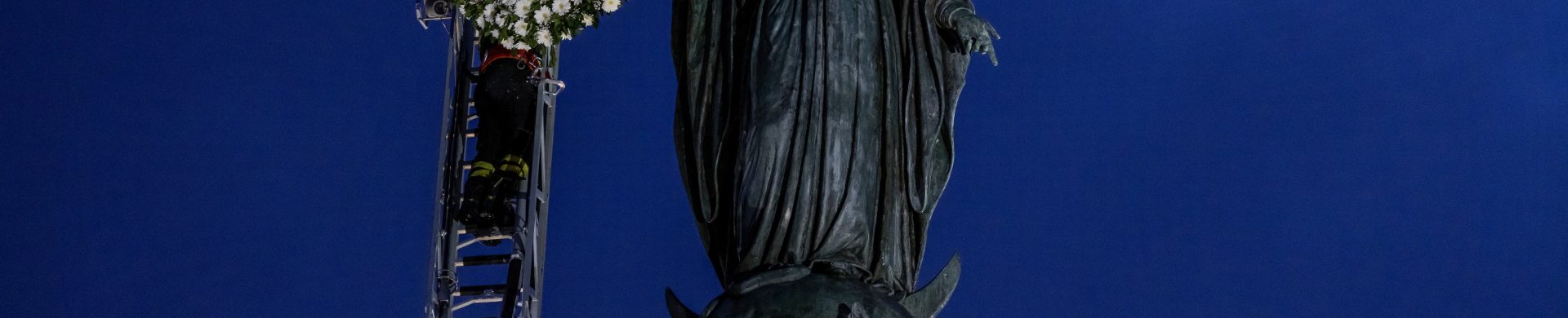 A firefighter places a wreath on the outstretched arm of a Marian statue near the Spanish Steps in Rome Dec. 8, 2024, the feast of the Immaculate Conception. Pope Francis was to pray at the statue later in the day, continuing the papal tradition of visiting the Spanish Steps on the feast day. (CNS photo/Pablo Esparza)