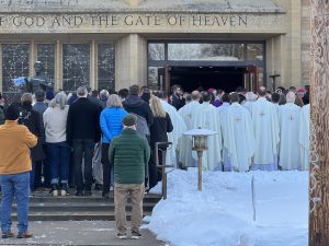The faithful gather with Archbishop Bernard A. Hebda of St. Paul and Minneapolis and Auxiliary Bishops Kevin T. Kenney and Michael Izen, Father Dennis Zehren, pastor of Annunciation, Father Tom Margevicius, master of ceremonies, and Deacons Kevin Conneely and Eric Cooley in front of the main doors to Annunciation Catholic Church in Minneapolis Dec. 6, 2025, for the “Rite of Reparation After the Desecration of a Church.” (OSV News photo/Joe Ruff, The Catholic Spirit)