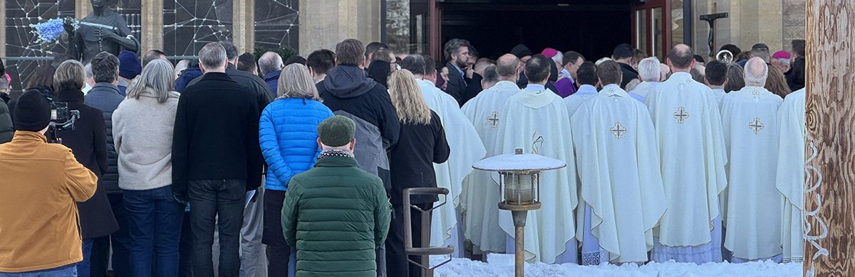 The faithful gather with Archbishop Bernard A. Hebda of St. Paul and Minneapolis and Auxiliary Bishops Kevin T. Kenney and Michael Izen, Father Dennis Zehren, pastor of Annunciation, Father Tom Margevicius, master of ceremonies, and Deacons Kevin Conneely and Eric Cooley in front of the main doors to Annunciation Catholic Church in Minneapolis Dec. 6, 2025, for the “Rite of Reparation After the Desecration of a Church.” (OSV News photo/Joe Ruff, The Catholic Spirit)