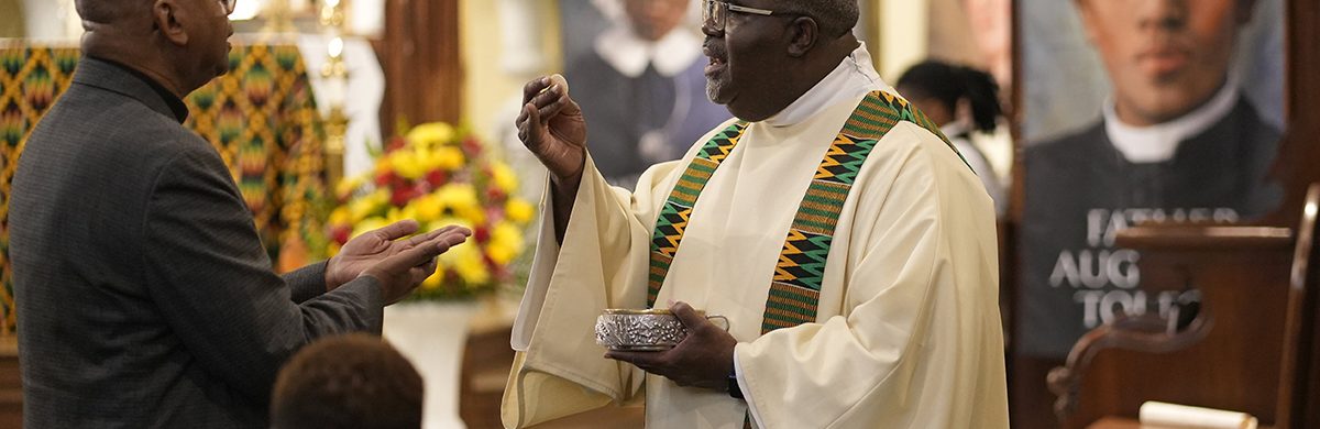 Deacon Michel Hodge distributes Communion during Mass at the inaugural New York Black Catholic Congress at Blessed Sacrament Church in New Rochelle, N.Y., Nov. 22, 2025. Two U.S. bishops in a Feb. 3, 2026, statement urged Catholics to be “faithful stewards of memory” and “courageous witnesses to truth” during Black History Month, observed in February. (OSV News photo/Gregory A. Shemitz)
